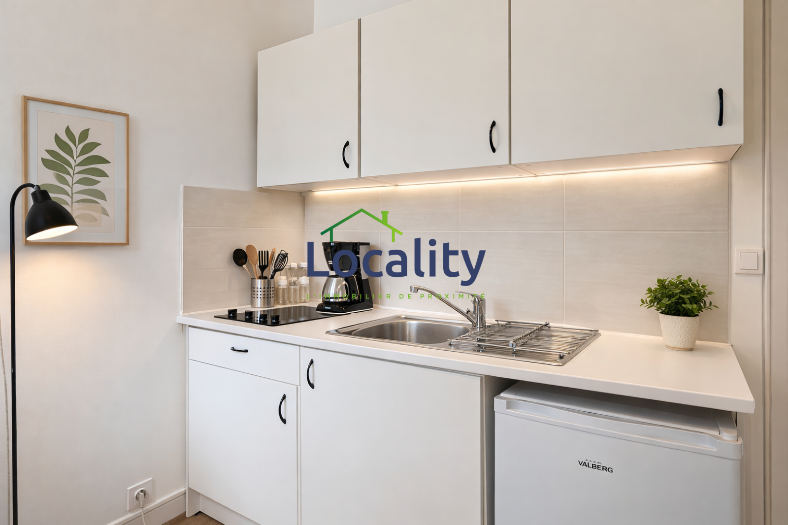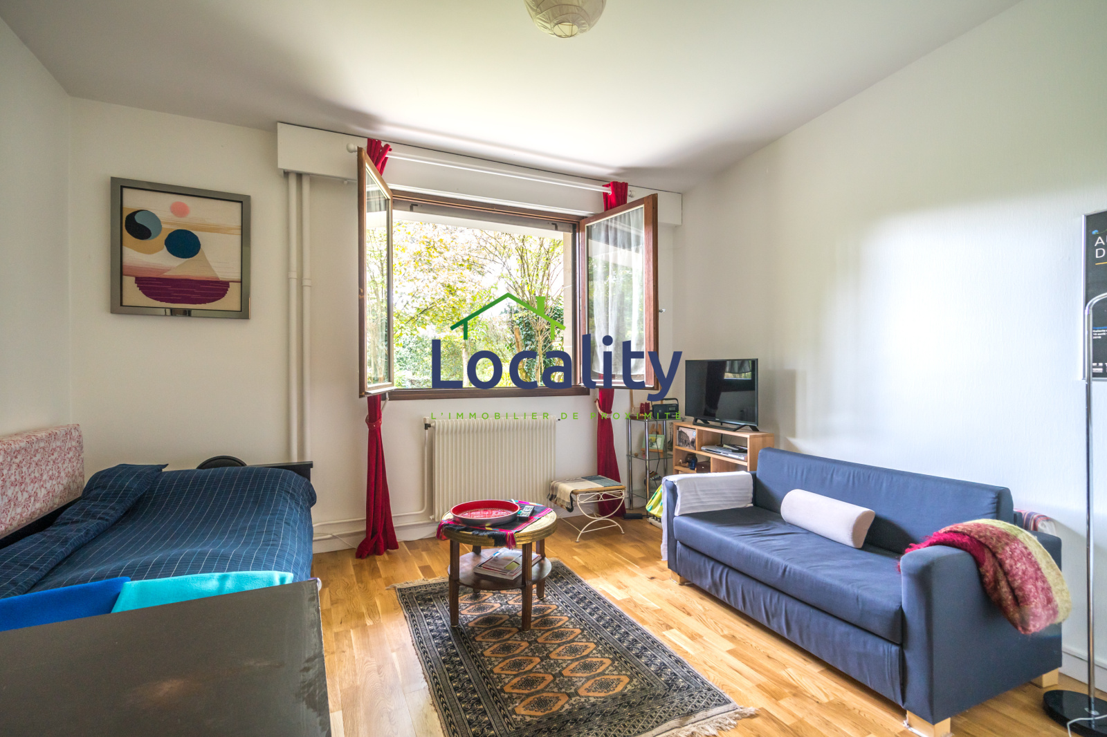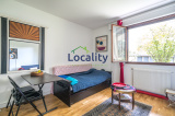 Les grandes fenêtres offrent une vue apaisante sur le jardin de la copropriété, ajoutant une touche de quiétude à ce lieu. Les équipements incluent une cuisine avec réfrigérateur, plaques de cuisson et four micro-ondes, un mobilier moderne et fonctionnel, le chauffage et l'eau chaude collectifs.